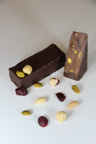 Barre de praliné feuilleté agrémenté de fruits secs (amandes, noisettes, pistaches, cramberries,...) enrobée de chocolat noir d'environ 100g. 3 achetées + 1 offerte.